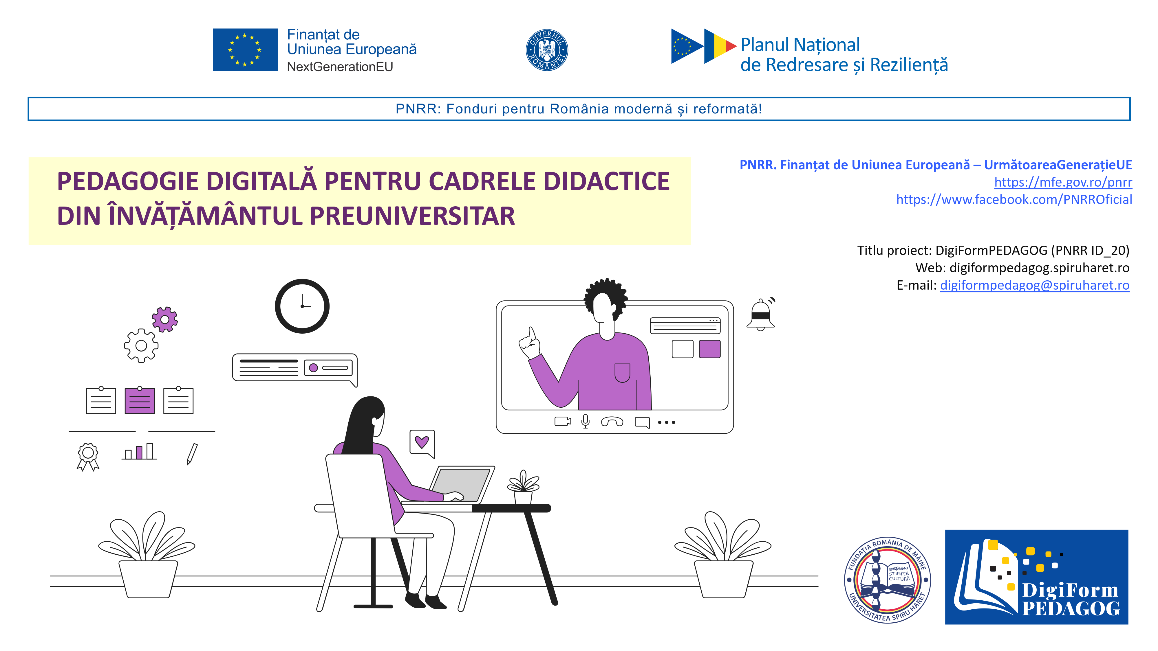 În cadrul proiectului DigiFormPedagog, Universitatea Spiru Haret își îndreaptă atenția spre îmbunătățirea calității activităților didactice prin folosirea de metode și instrumente digitale moderne în baza competențelor dobândite prin participarea la programul de formare și dezvoltare profesională continuă Pedagoie digitală adaptată ariilor curriculare.