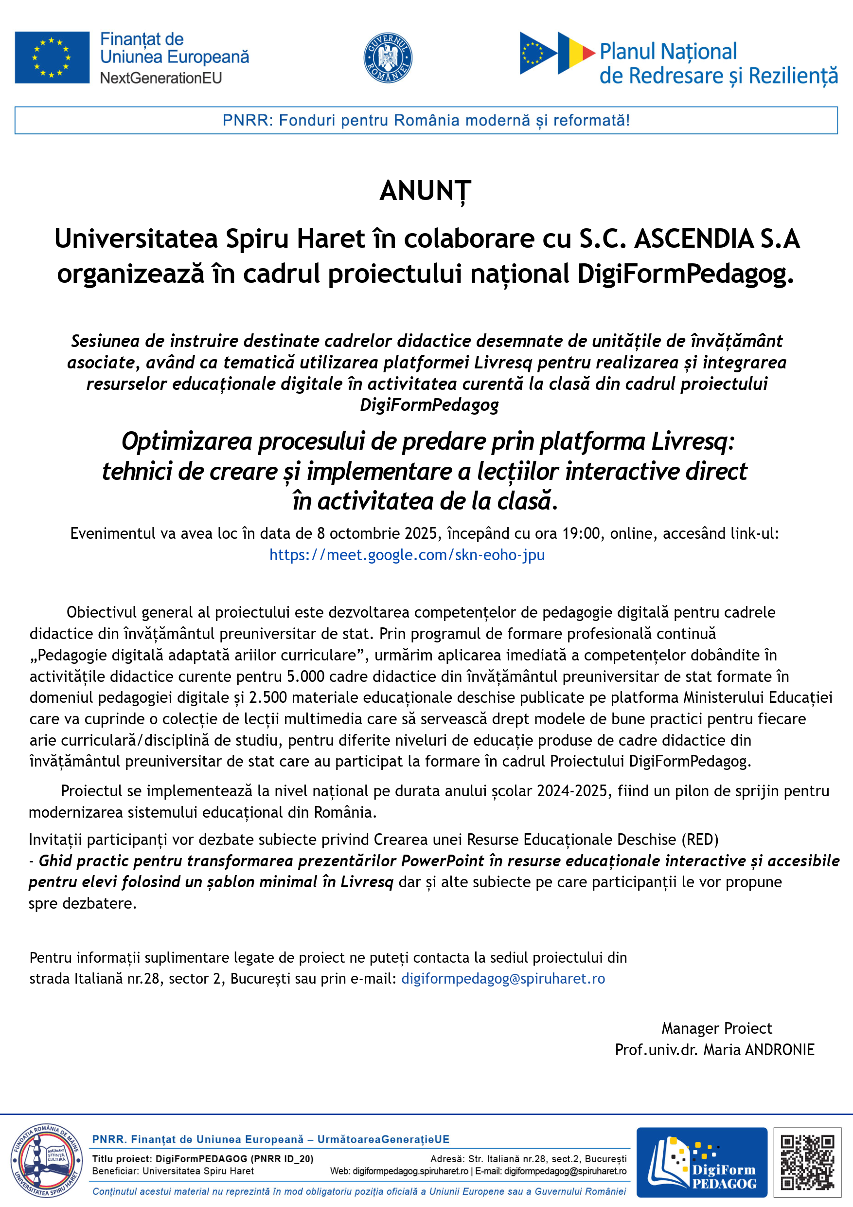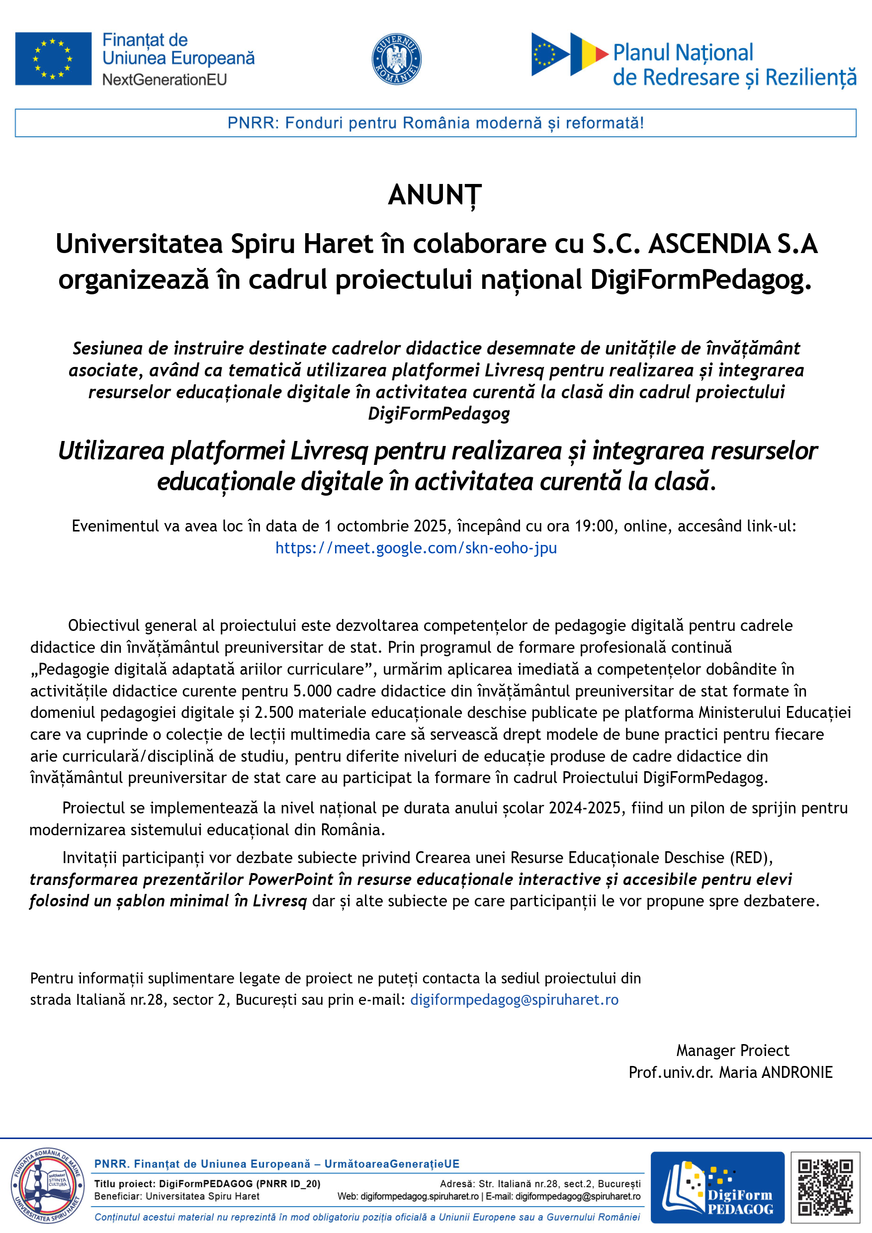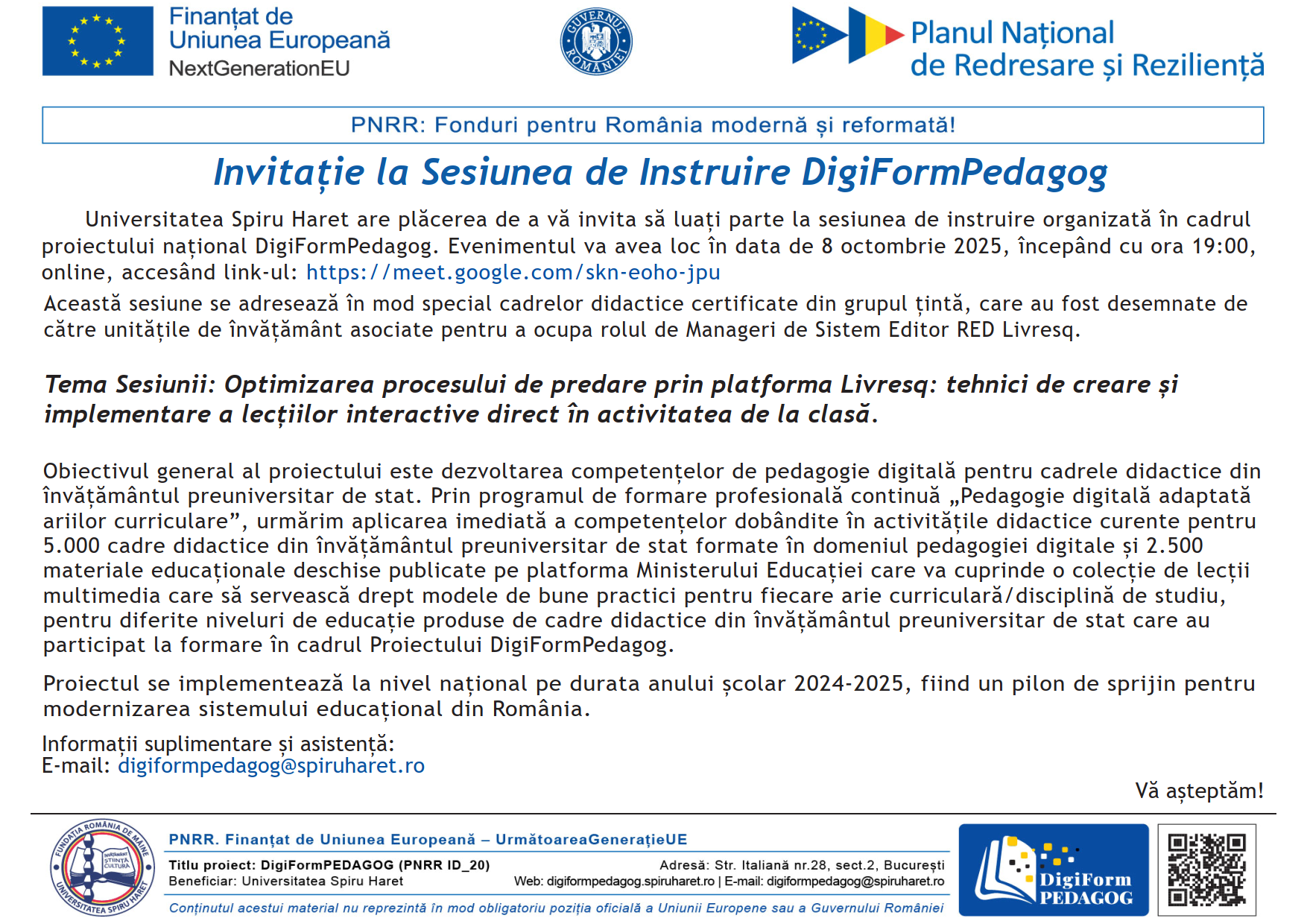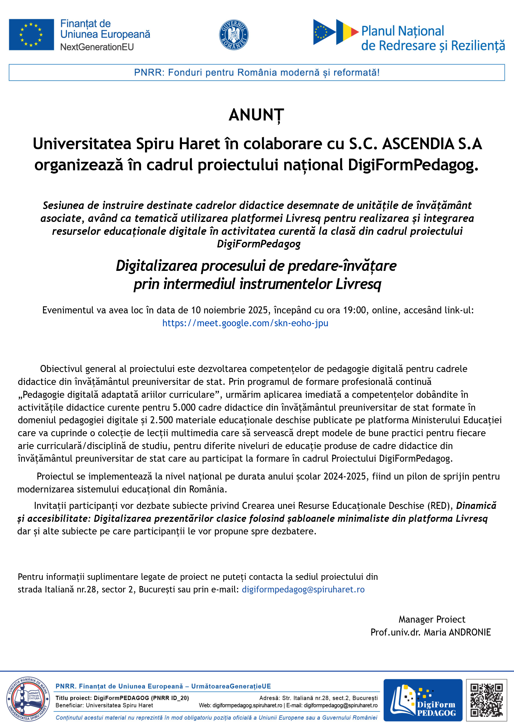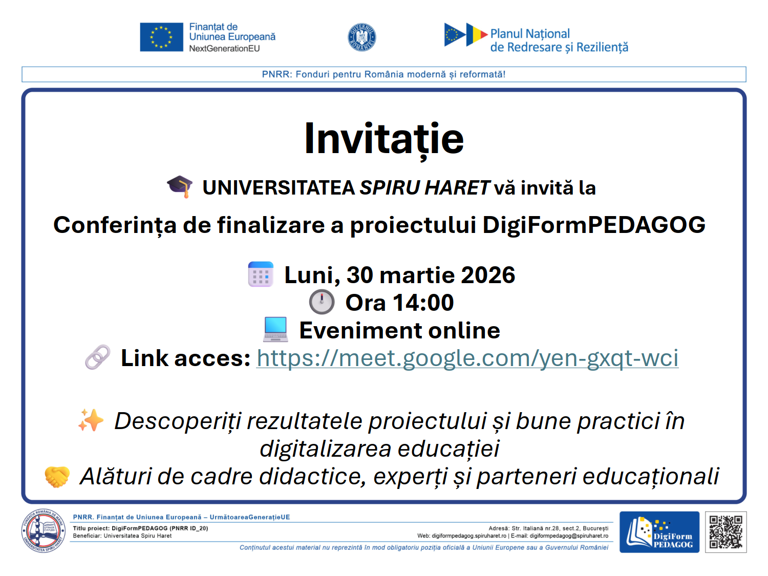 Universitatea Spiru Haret are plăcerea de a anunța organizarea Conferinței de finalizare a proiectului DigiFormPEDAGOG, un eveniment dedicat promovării inovației și digitalizării în educație.