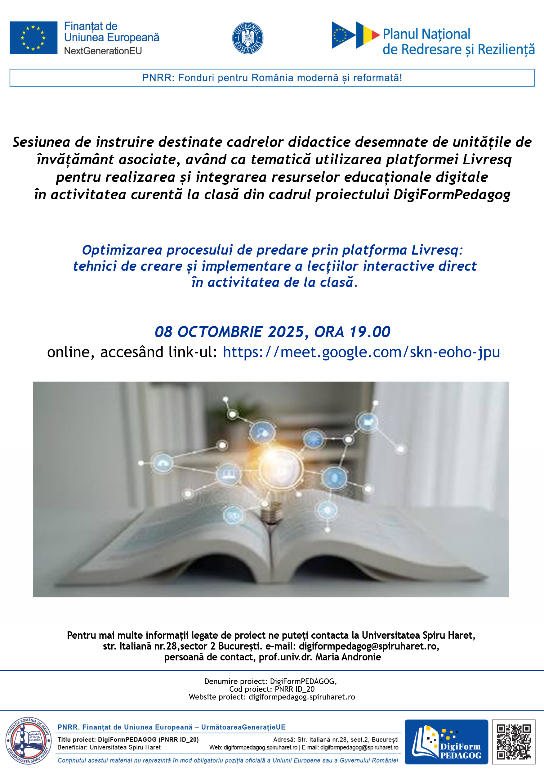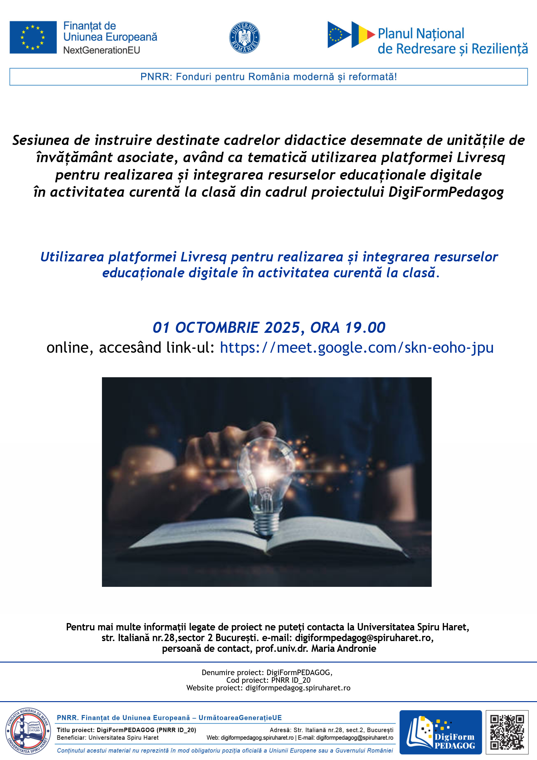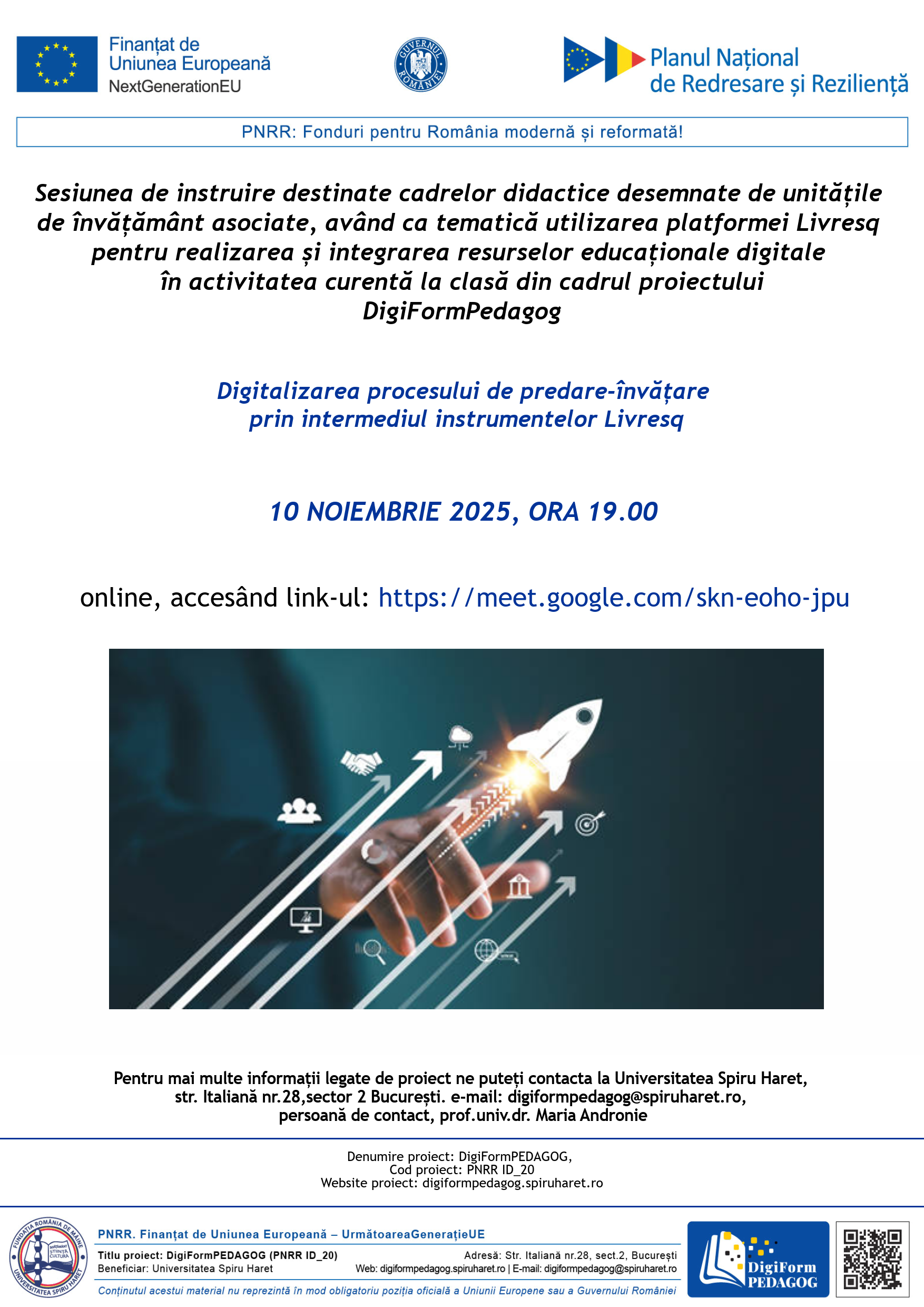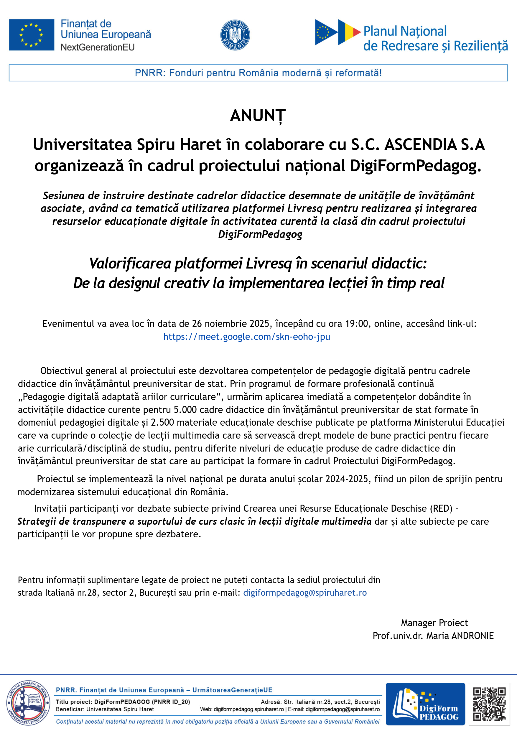 Universitatea Spiru Haret are plăcerea de a anunța organizarea Conferinței de finalizare a proiectului DigiFormPEDAGOG, un eveniment dedicat promovării inovației și digitalizării în educație.
