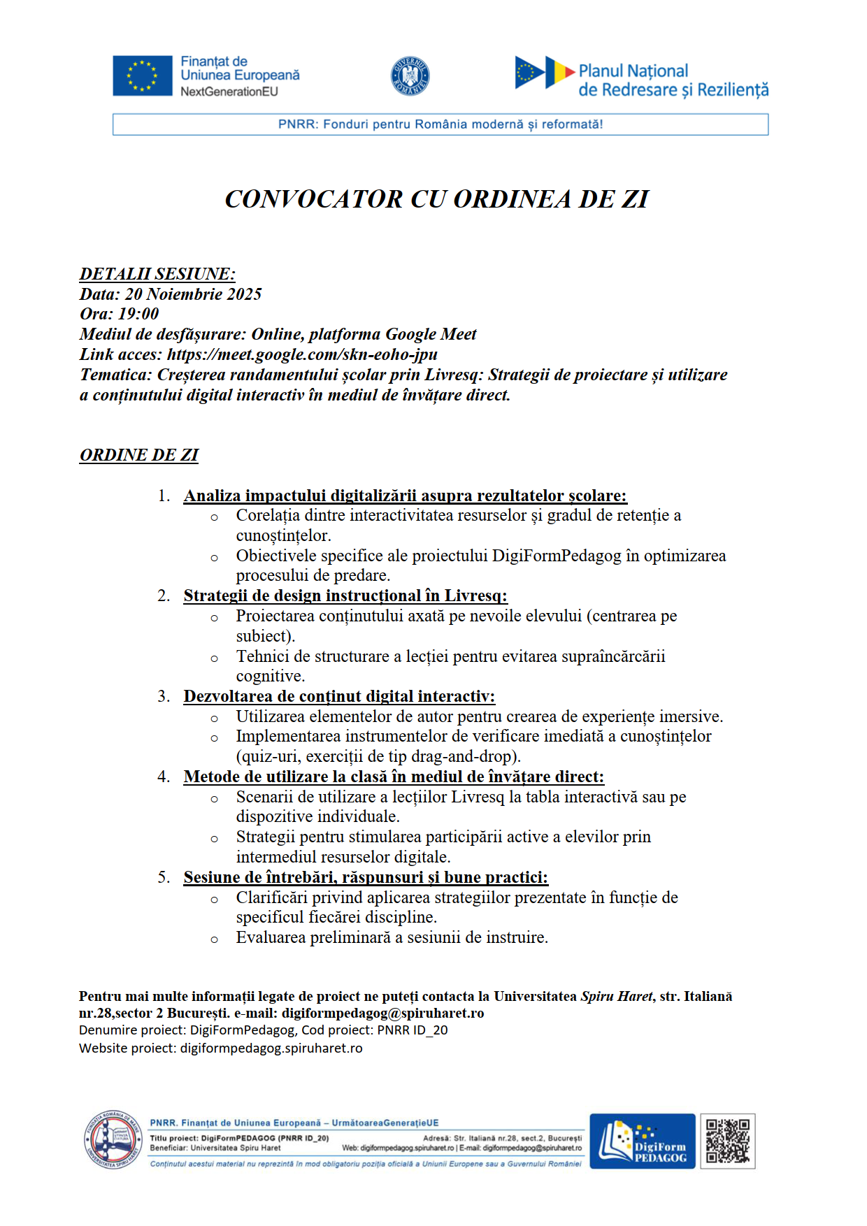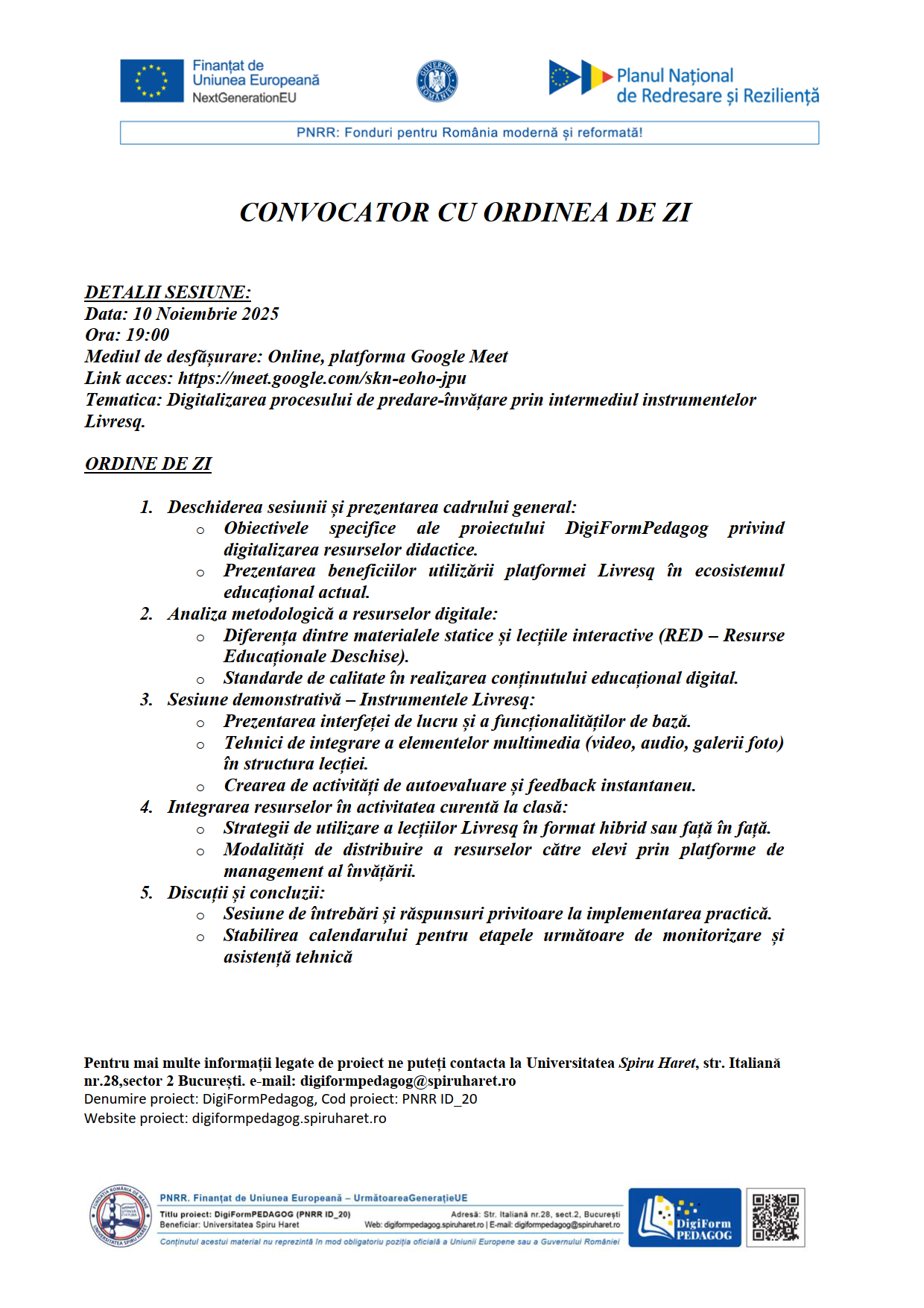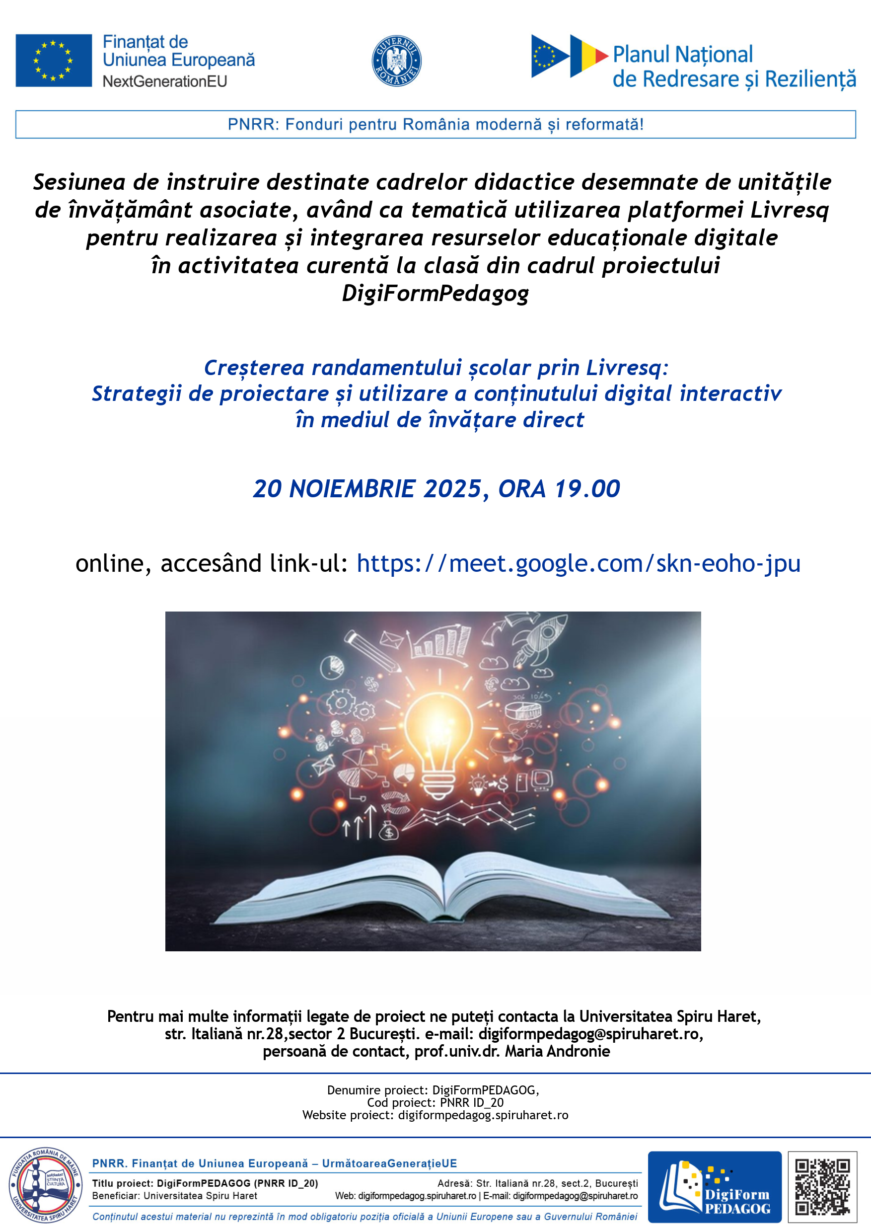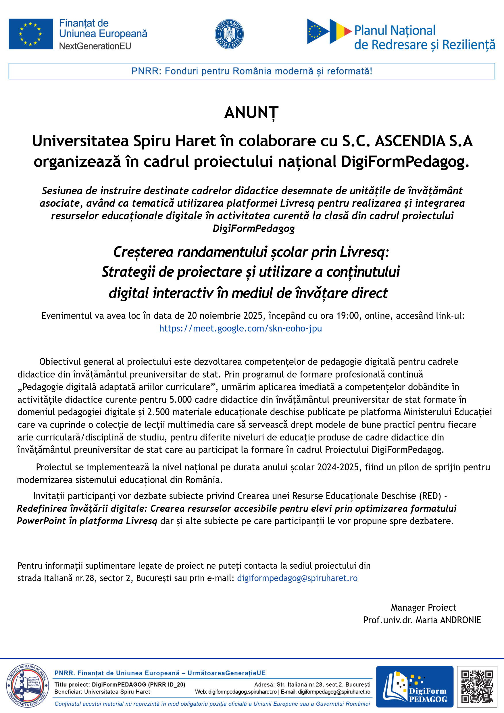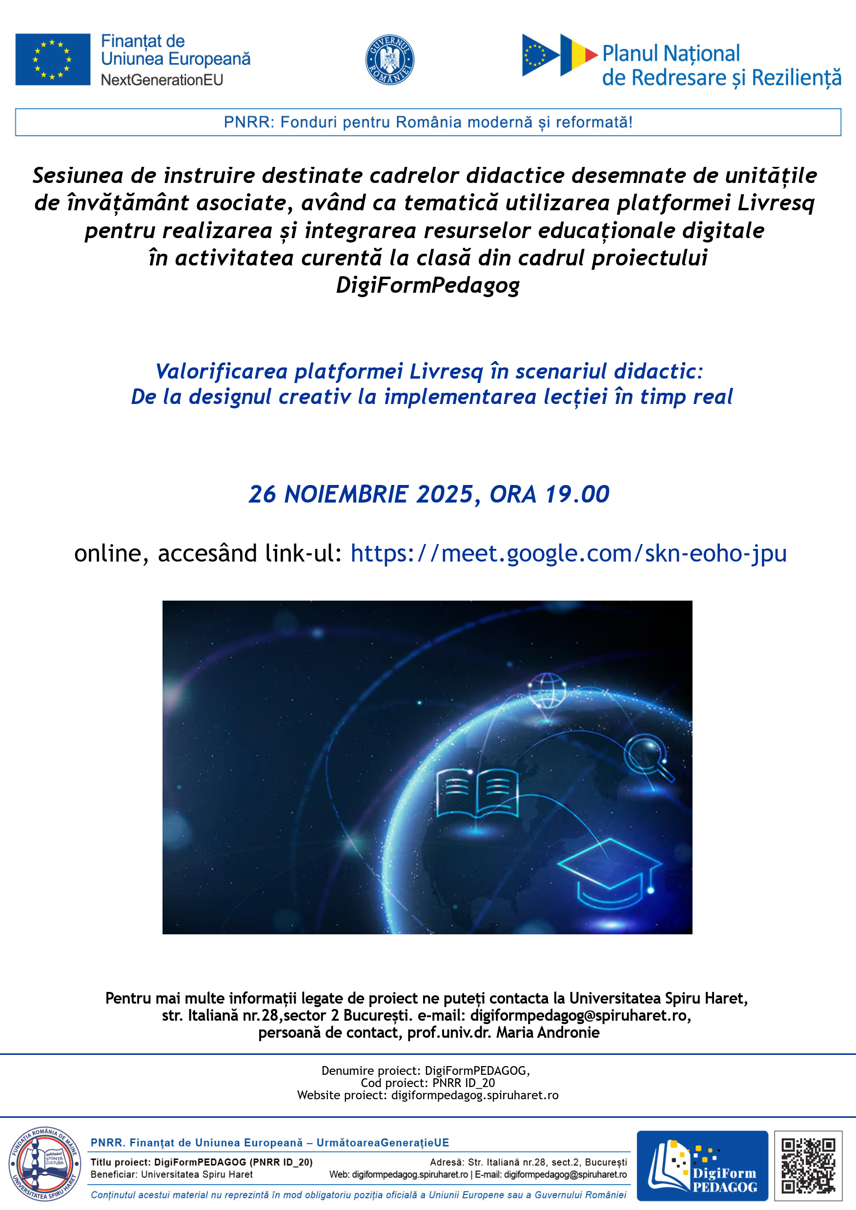 Universitatea Spiru Haret are plăcerea de a anunța organizarea Conferinței de finalizare a proiectului DigiFormPEDAGOG, un eveniment dedicat promovării inovației și digitalizării în educație.