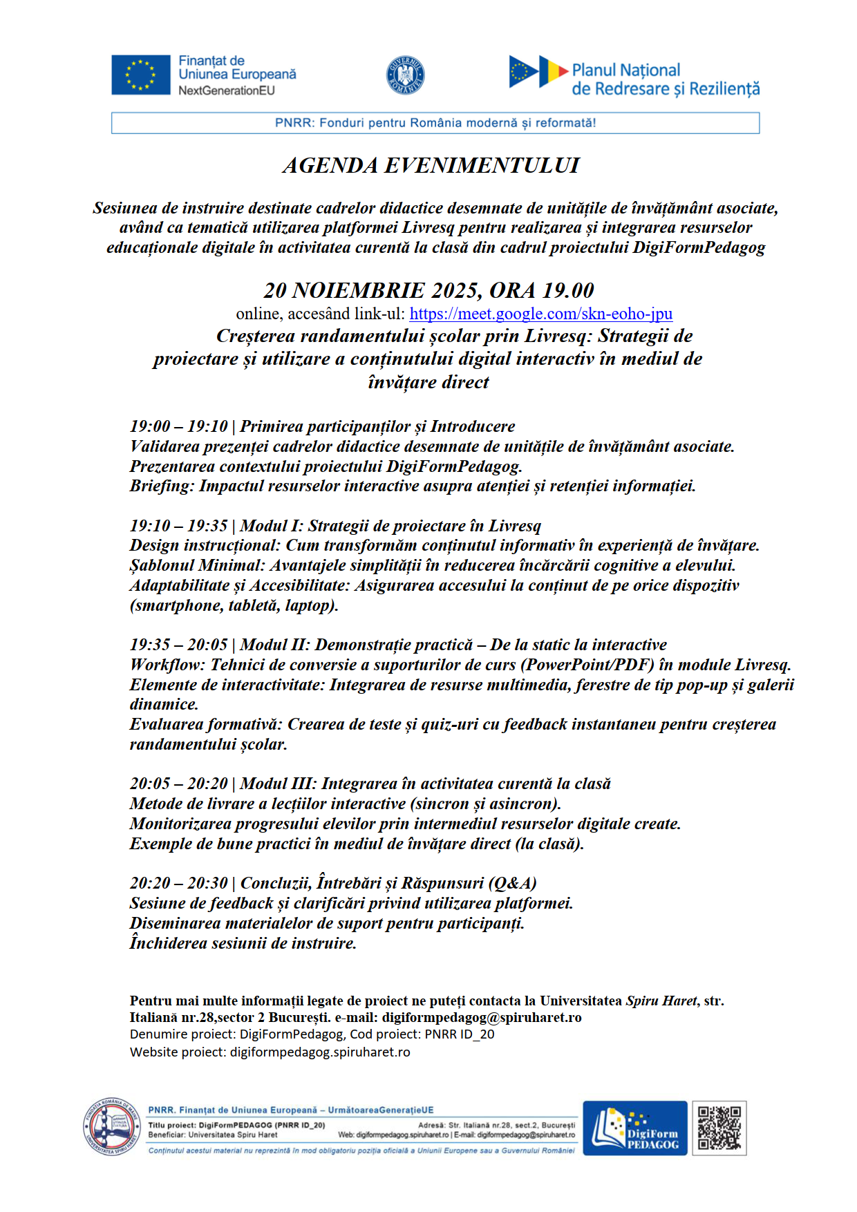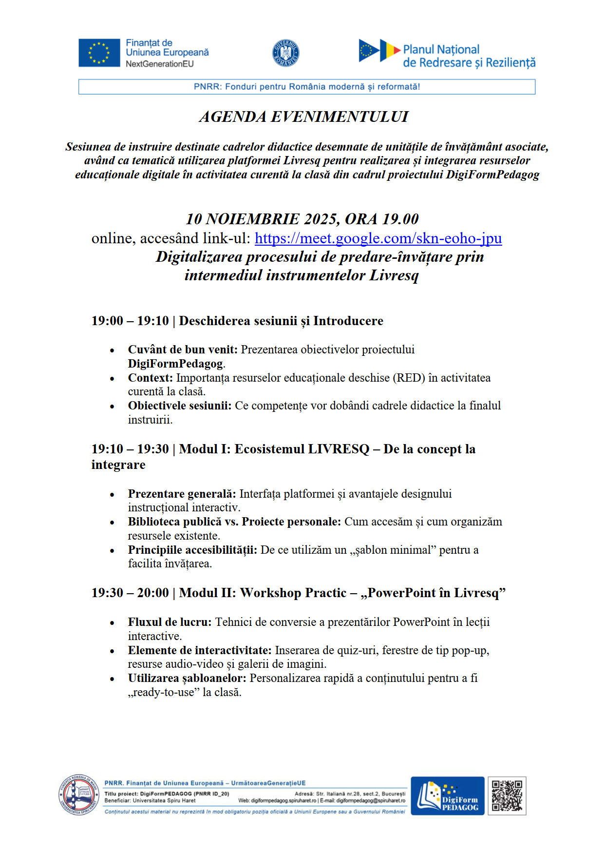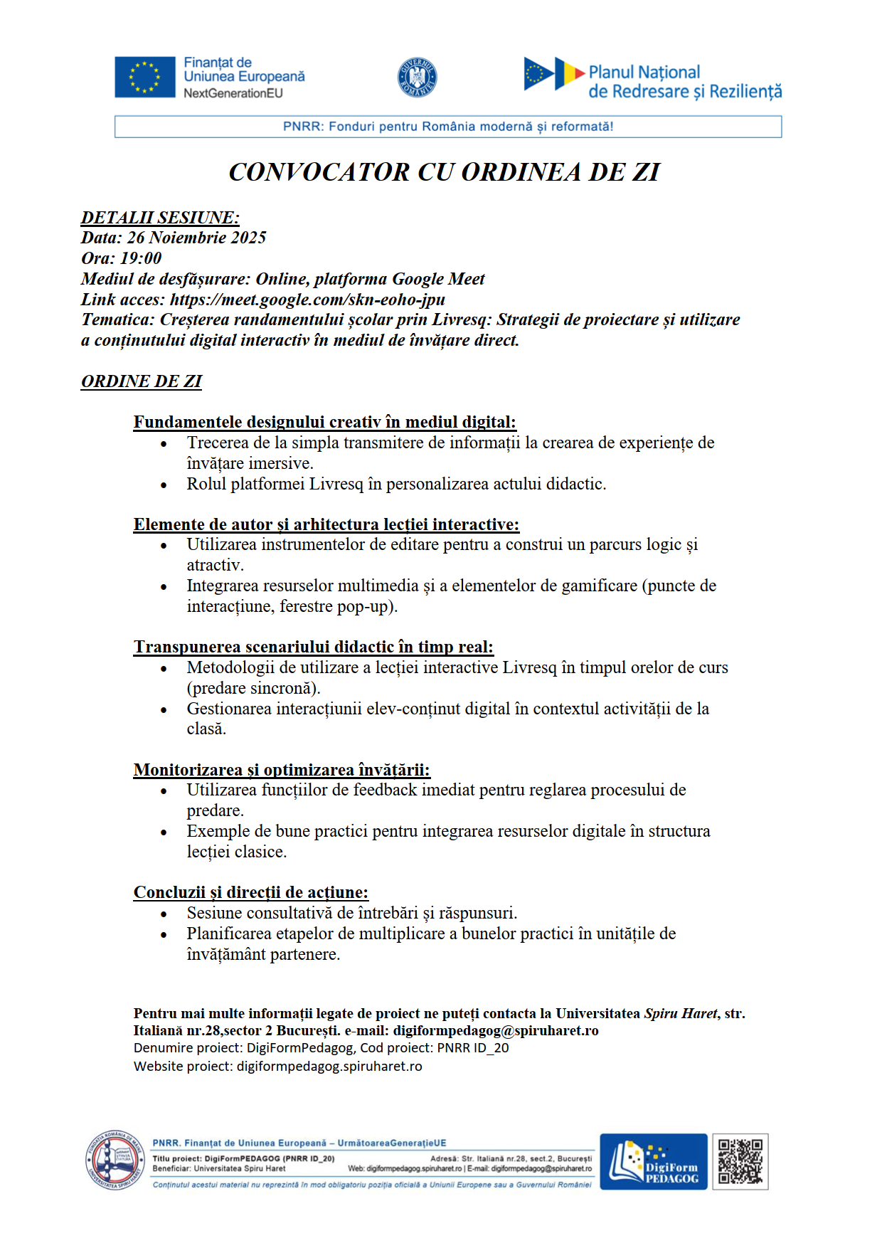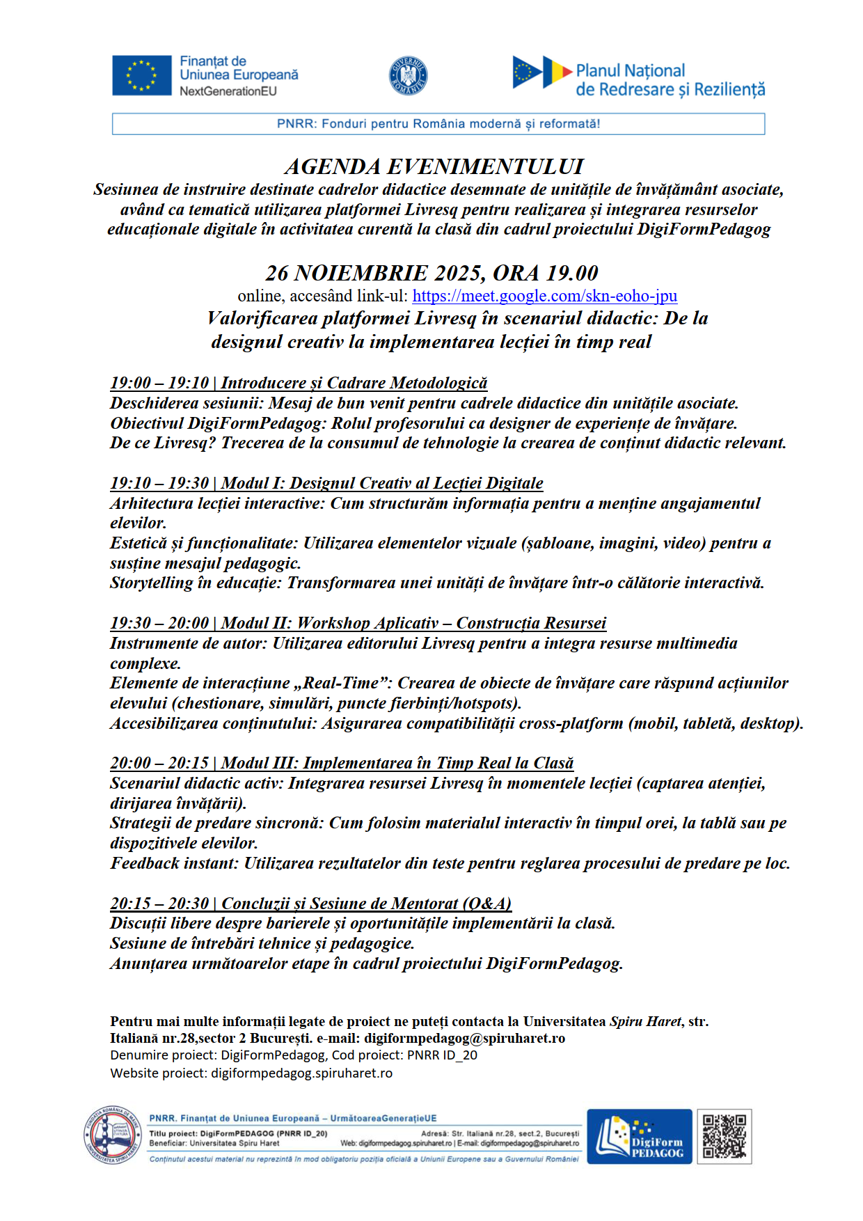 Evenimentul va avea loc luni, 30 martie 2026, începând cu ora 14:00, în format online, și va reuni cadre didactice, experți în domeniul educației, precum și parteneri implicați în implementarea proiectului.