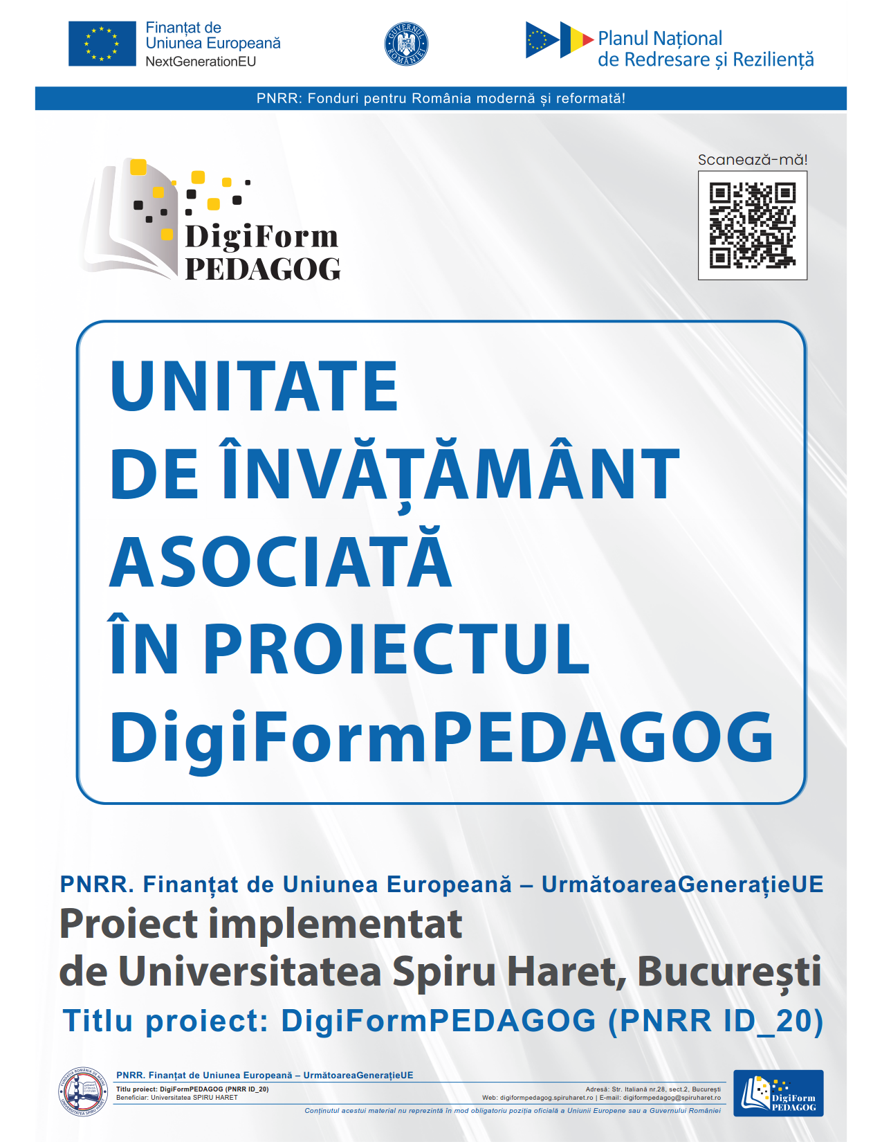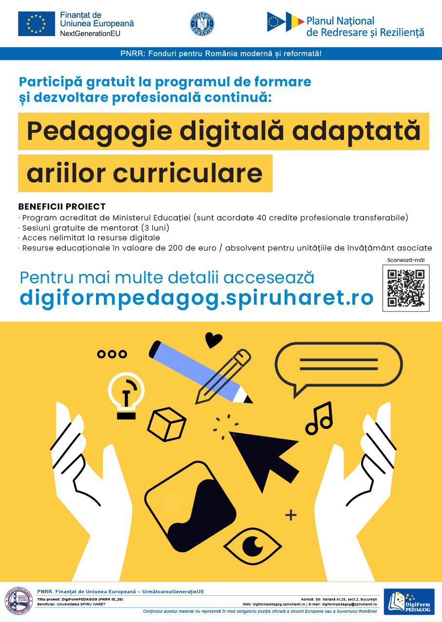 Pentru mai multe informații despre proiectul "DigiFormPedagog" vă rugăm să vizitați site-ul oficial al proiectului digiformpedagog.spiruharet.ro