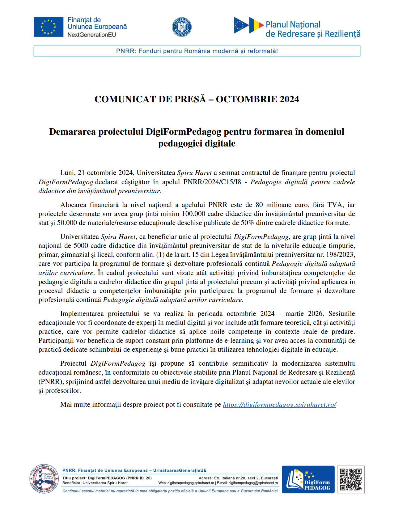 Universitatea Spiru Haret anunță aprobarea finanțării PNRR pentru proiectului "DigiFormPedagog", un demers ambițios de formare și dezvoltare profesională continuă a cadrelor didactice din învățământul preuniversitar de stat din România destinat îmbunătățirii competențelor digitale și de pedagogie digitală.